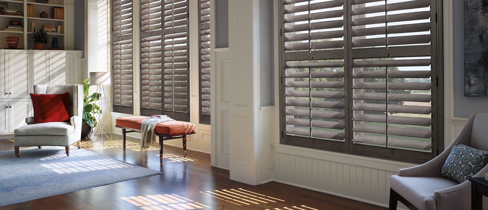 Add traditional style and control light and glare with plantation shutters, cafe shutters, faux-wood shutters, Bahama shutters, and beach house shutters.